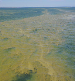 Cyanobakterieblomning 18 juli 2013 mellan Danmark och Tyskland. Bilden är taget från fartyget Transpaper som har ett Ferrybox-system ombord. Foto: Bengt Karlson