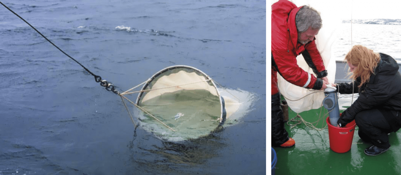 Provtagning av manter med håv som dragits horisontellt i vattnet. Foto: Lene Fris Möller (t.v.) och Christine Ditlefsen (t.h.)